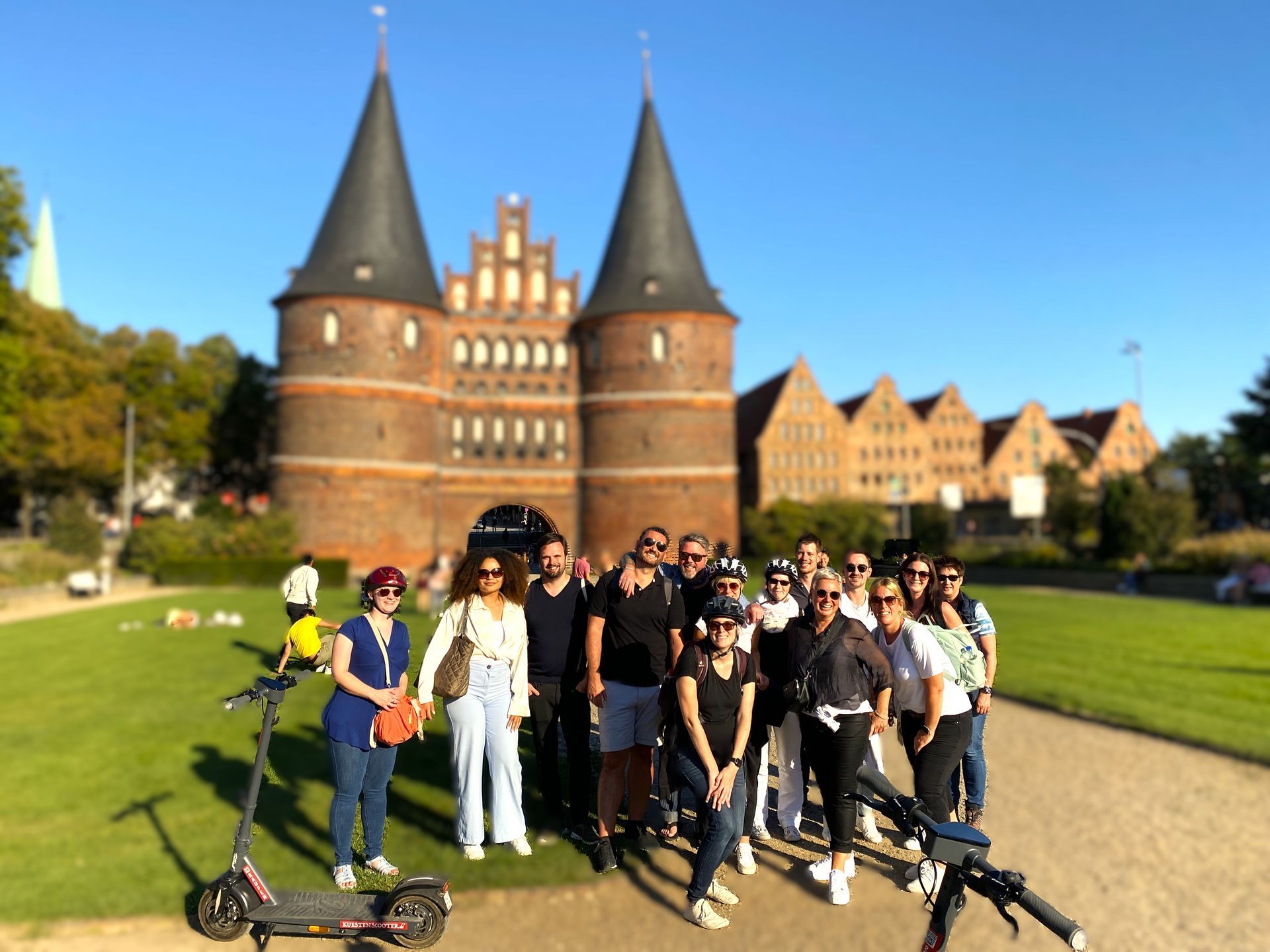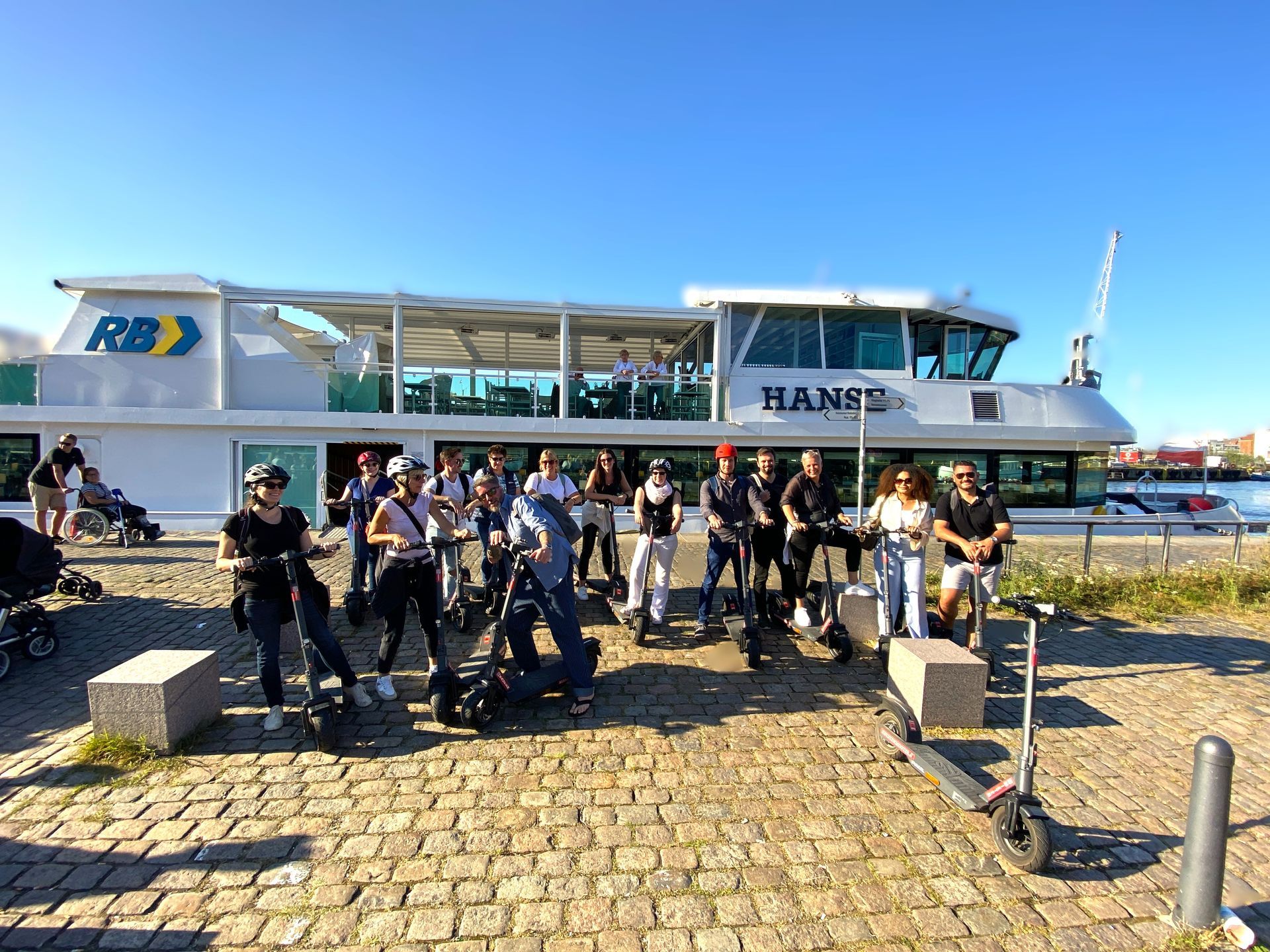 Weiter ging es über den Niendorfer Hafen nach Travemünde, wo uns ein leckeres Mittagessen erwartete. Anschließend stiegen wir mit unseren E-Scootern auf die MS Hanse (kleines Fährschiff) auf und genossen die Flussfahrt auf der Trave von Travemünde nach Lübeck.